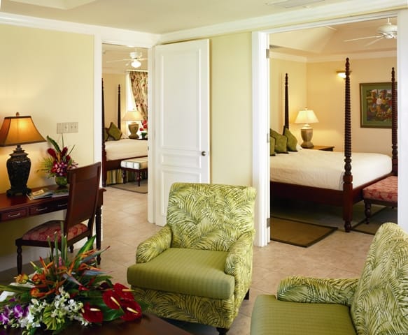For families, I would choose from the 68 1-2 BR Hibiscus suites (where we stayed), the 18 Royal suites or 11 Imperial Suites that are renovated. Located directly on the ocean (where you can lounge quietly in contrast to the more crowded Sunset Beach where the West cottages are located), these accommodations are very spacious with large verandas or patios and offer interconnecting 1-BR Suites. As these units house 4 1-BR suites in individual units, larger families can request all four suites (which our friends did for their extended family). We were quite pleased with our accommodations 06/6a – only a few steps from the hub of the resort but distant enough not to be distracted by any noise. Each of our connecting rooms (designed in a West Indies style) were spacious, with oversized bathrooms and outdoor space, and ample closet space.